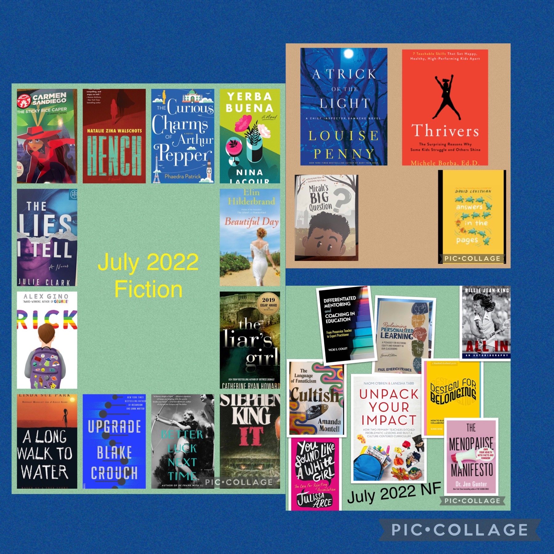 What a great reading month for me!! I love summer reading, especially when I had a long plane trip and down time in which I could read a lot this month! I also discovered that I actually can do adult fiction on audiobook, at least occasionally. I read so much that I had to make two photo collages to capture it all, so I separated them by fiction and nonfiction (and realized afterwards that I still missed some covers in those pictures and had to add a 3rd mini collage!). In July I read: