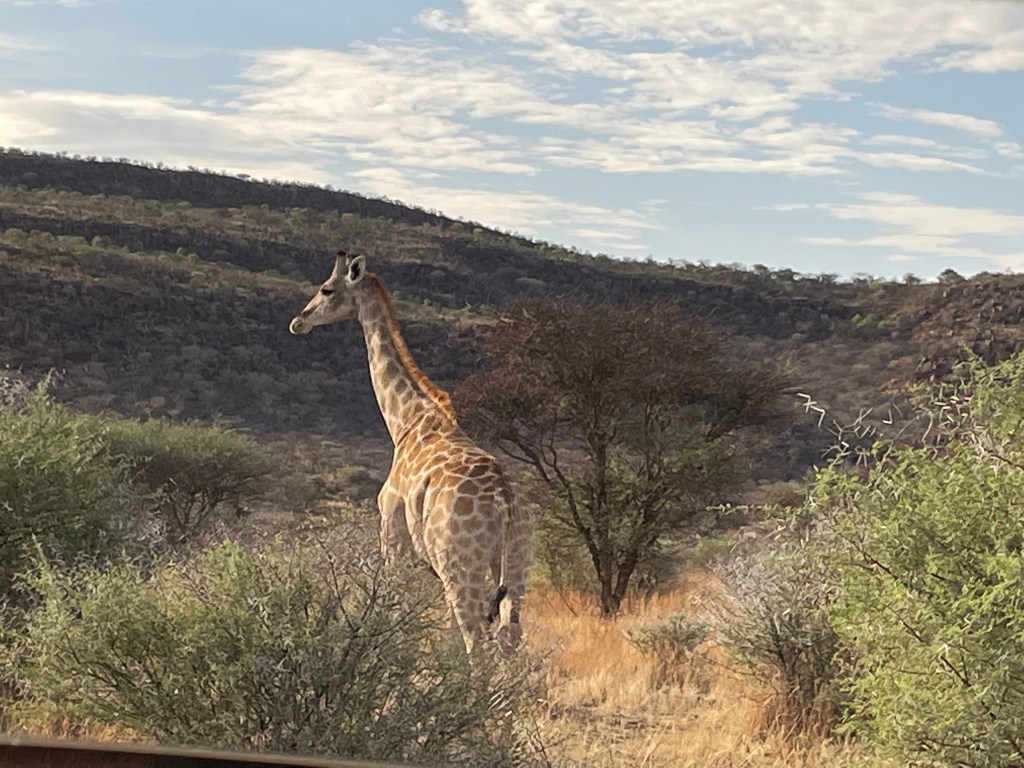 During our 12 day tour of Namibia, we spent a LOT of time in a very bumpy bus. You get to see a lot of a country this way, but just imagine a group of American and Canadian women in a bus with no working air conditioning, on roads that are unpaved most of the time, driving through ever-changing desert landscapes for hours on end. We did our best not to be crabby, and to be grateful for each spot where we could use an indoor bathroom and purchase bottled water. While my eyes and throat stung from the dusty roads blowing into our open windows during this hot summer time, every day I turned to my friend and said, “I can’t believe how different each place looks.” From the dry, brown deserts to the fields of green trees, to tumble weeds and small brush, to cactus, to red sands of the Kalahi Desert, to canyons, to the place where the desert meets the sea, where the Skeleton Coast begins, you never knew what we might see outside of that bus. We saw giraffes on the way from the airport to the first hotel, and many other days after that!