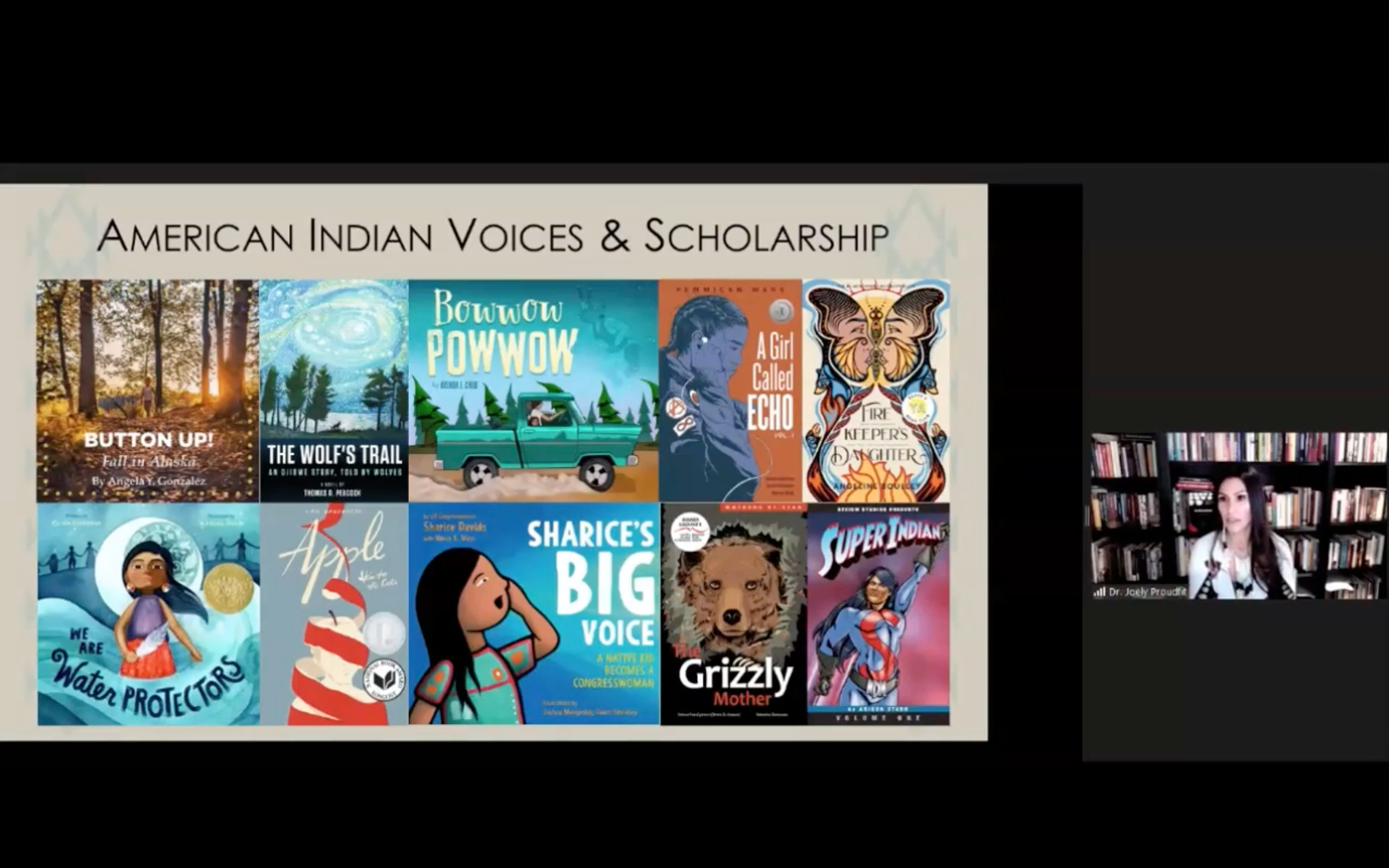 Below is a screenshot from one of the microcourses, featuring Dr. Joely Proudfit and a small selection of recently published books she recommended to teachers to include greater accurate representation in our classroom libraries.