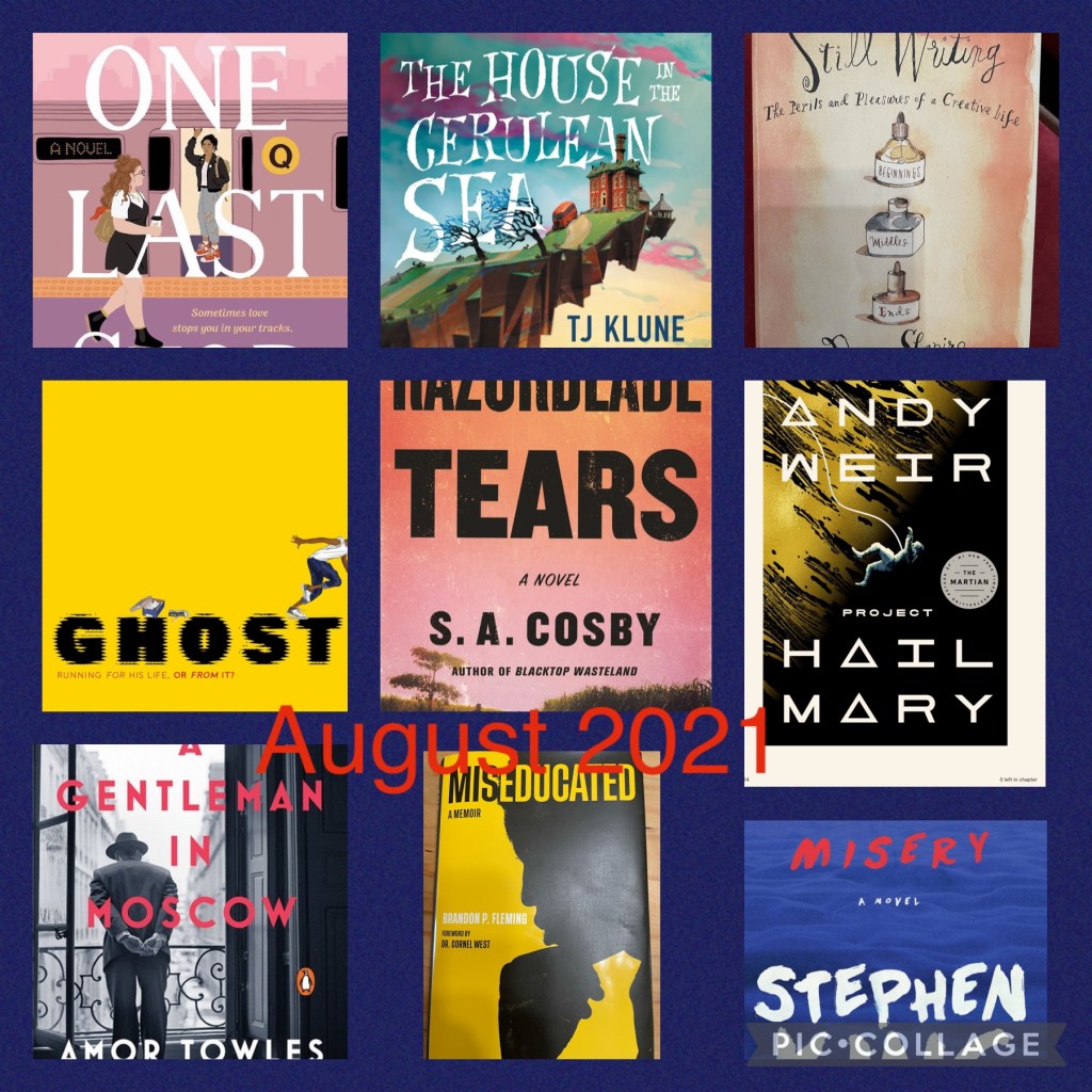 The House in the Cerulean Sea by T.J.Klune – Technically I finished this on July 31, but I had already published my July list, so here it is! I LOVED this beautiful YA novel! Linus Baker is a curmudgeon, who lives with his cat and works hard at his government job, inspecting orphanages that include magical children. But when he is sent on a classified assignment to review the situation in a special place, his entire world turns upside down. As he gets to know Arthur and the six children in the house in the cerulean sea, Linus learns about himself, love and friendship, and when it’s time to break the rules. I loved the musical references to many “golden oldies” and the interesting characters throughout the story. I love that a queer author was able to tell a genuine queer love story amongst fantasy and magic and some insane plot points!